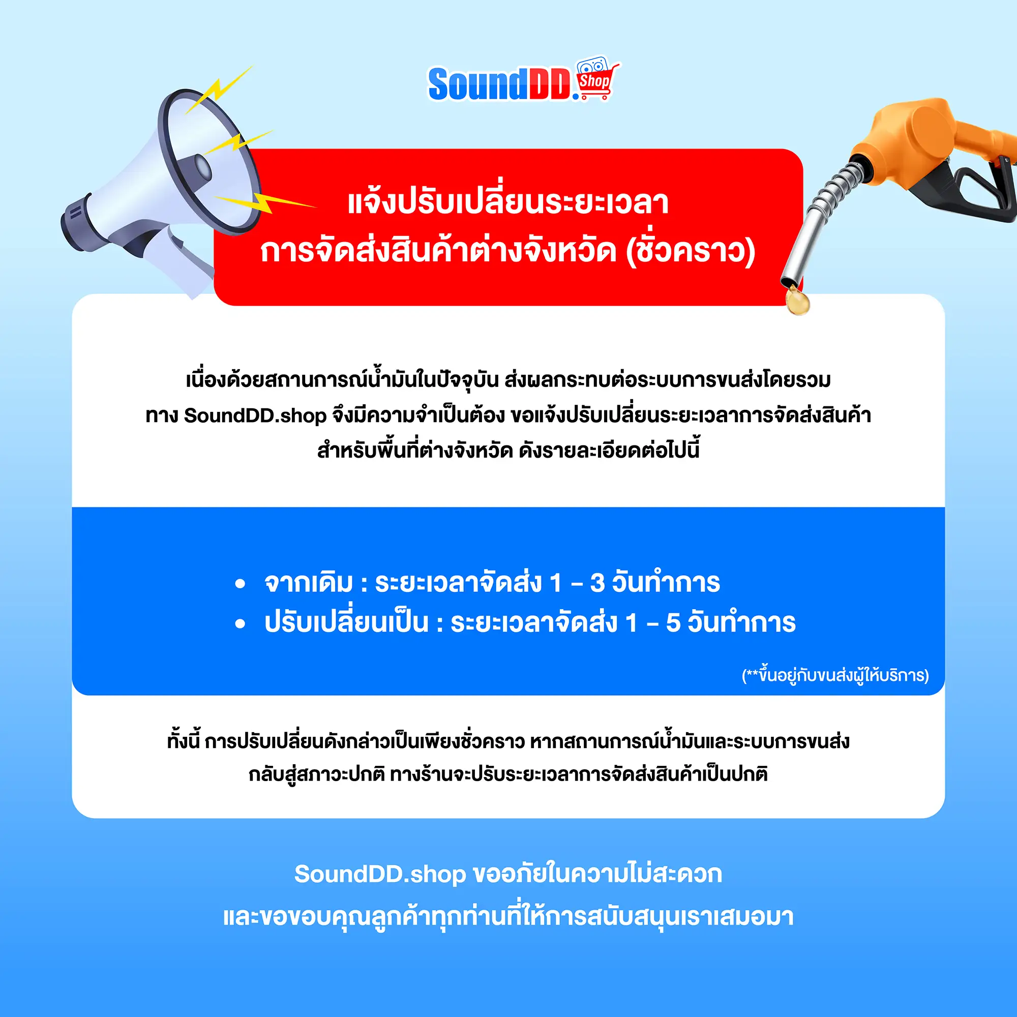 เช็คเลขพัสดุได้อย่างมั่นใจทุกขนส่ง จัดส่งอย่างมีระบบ รวดเร็วทันใจ ครบตามเงื่อนไข จัดส่งสินค้าให้เร็วที่สุด ระยะเวลาจัดส่ง วันจันทร์-วันเสาร์ (ไม่รวมวันอาทิตย์ และวันหยุดนักขัตฤกษ์) *ติดตามขอหมายเลขสินค้า / Tracking ได้ที่ Line : @SoundDD.Shop
