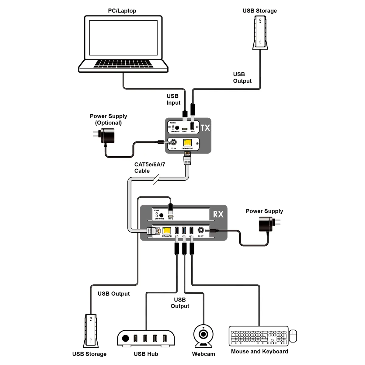 ตัวรับสัญญาณ (Receiver) นี้รองรับการเชื่อมต่ออุปกรณ์ USB 3.2 ได้สูงสุด 4 อุปกรณ์จากระยะไกล เช่น แฟลชไดรฟ์ คีย์บอร์ด และกล้อง USB โดยพอร์ต USB-C สามารถรองรับการจ่ายไฟ 5V/3A เมื่อใช้งานร่วมกับอะแดปเตอร์ และพอร์ต USB-A สามารถจ่ายไฟได้ 5V/0.9A ให้กับอุปกรณ์ USB