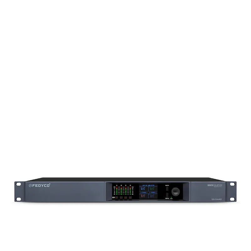 เพาเวอร์แอมป์ FEDYCO QMX 4.4D 4 ชาแนล 4 x 400 วัตต์ ที่ 8 โอห์ม รองรับ Dante พร้อมระบบ DSP พัฒนาด้วยเทคโนโลยี Class D มาพร้อมหน้าจอ TFT สีแบบ IPS จากแบรนด์ FEDYCO