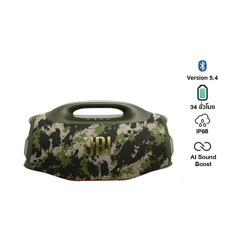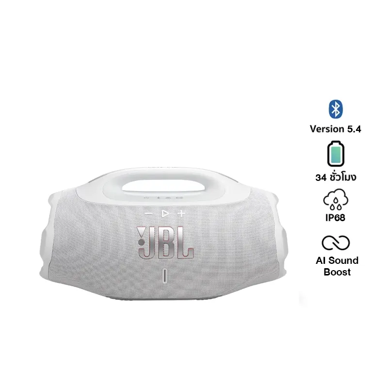 JBL Boombox 4 ดีไซน์ใหม่ใหญ่กว่า, ดังกว่า, แต่เบากว่าเดิม ให้พลังเสียงระดับตำนานด้วย JBL Pro Sound เบสหนักแน่น ชัดใสทุกจังหวะ พร้อม AI Sound Boost ปรับเสียงอัตโนมัติให้ทรงพลังไร้เสียงแตก ปรับสไตล์เสียงด้วย 2 โหมด Bass Boost – Deep Bass และ Punchy Bass กันน้ำกันฝุ่นระดับ IP68 พกไปได้ทุกที่ แบตเตอรี่เล่นต่อเนื่องสูงสุด 34 ชั่วโมง พร้อม Playtime Boost ให้ปาร์ตี้ไม่สะดุด สนุกได้ยาวนาน