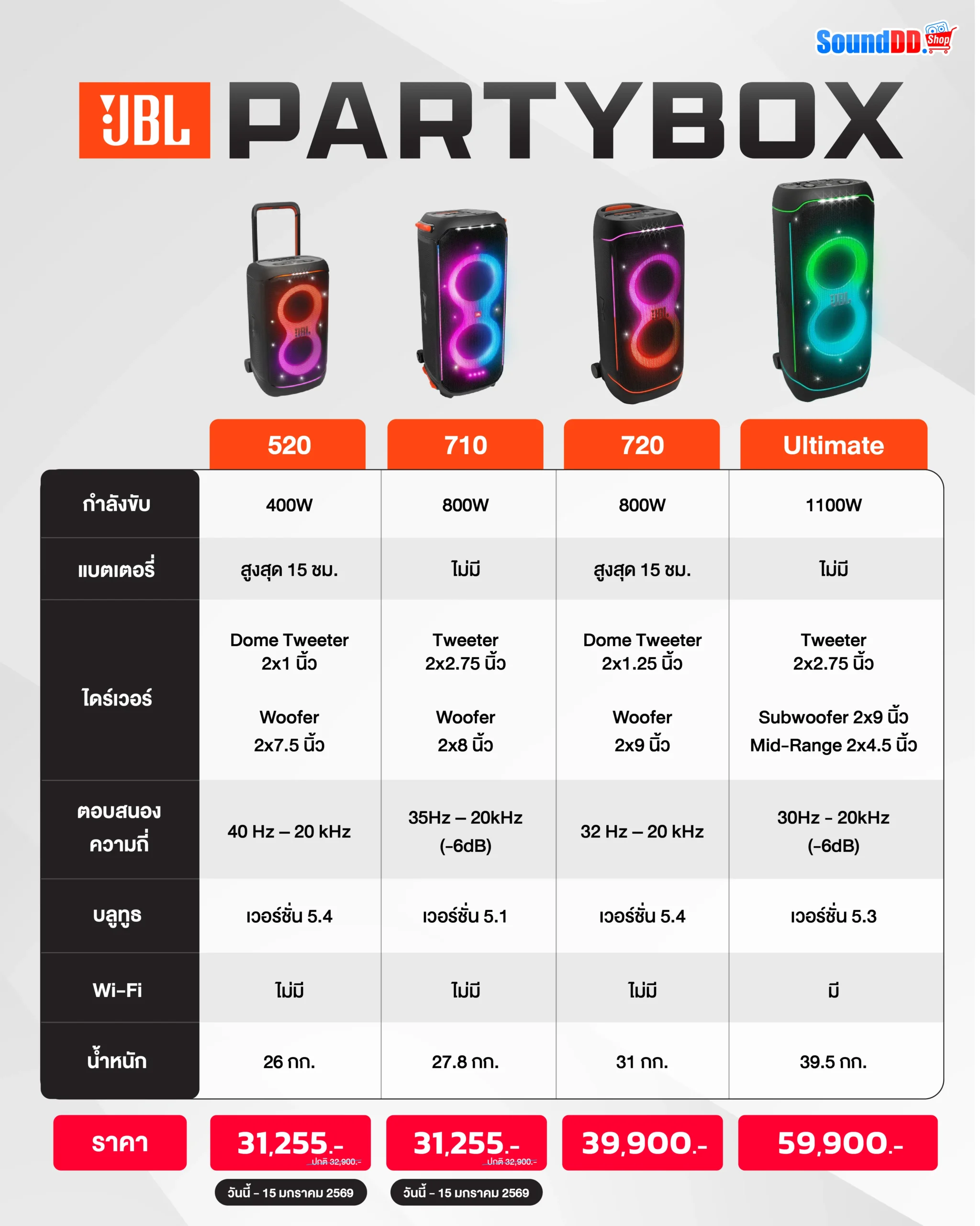 ลำโพงปาร์ตี้ JBL PartyBox 520 ที่มี AI Sound Boost เพิ่มคุณภาพเสียงด้วย AI อัจฉริยะ กำลังวัตต์ 400 วัตต์ ป้องกันน้ำตามมาตรฐาน IPX4 แบตเตอรี่ใช้งานได้ 15 ชม. จากแบรนด์ JBL