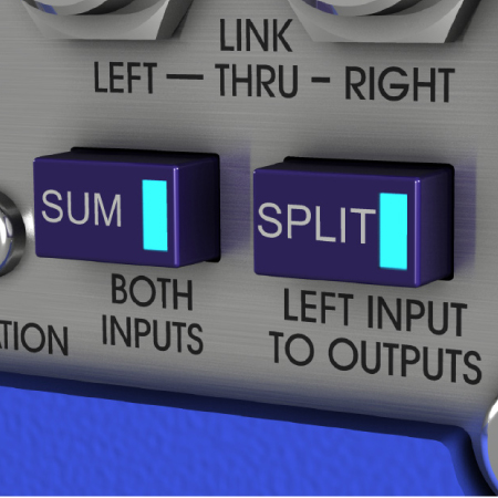 DN200 offers two flexible signal routing options, in Sum mode both inputs are summed at -6 dB to maintain the overall signal level and are routed to the left output. In Split mode, the left input is routed to both outputs at unity gain. Both option switches include LEDs for clear indication of signal routing.