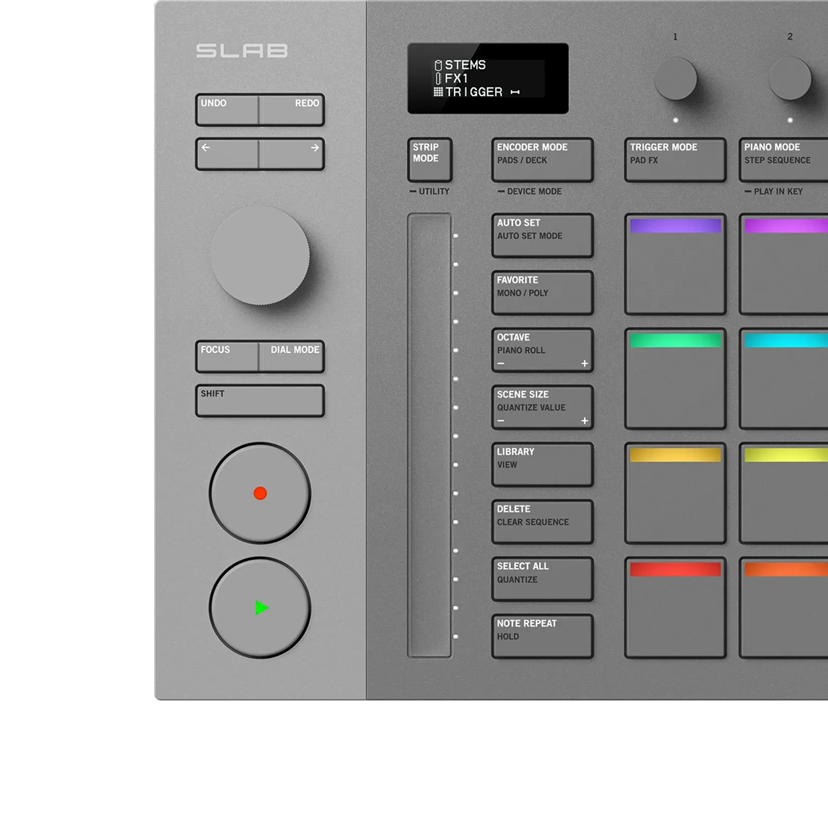 Step Sequencer ที่ติดตั้งมาในตัว SLAB ช่วยให้คุณสร้าง และแก้ไขแพตเทิร์นกลองได้อย่างเป็นธรรมชาติโดยตรงจากฮาร์ดแวร์ สามารถปรับค่า Velocity ของแต่ละสเต็ป จังหวะเวลา (Timing) สวิง (Swing) และการตั้งค่า Grid ได้แบบเรียลไทม์ เพื่อการโปรแกรมจังหวะที่มีไดนามิกและควบคุมได้อย่างแม่นยำด้วยการสัมผัส