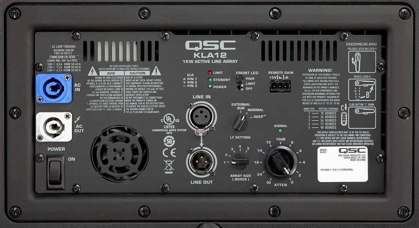 In an installed application, multiple KLA Series loudspeakers can be “daisy-chained” for total gain control from a single remote pot wired to the on-board Phoenix-style connector. Additional power module characteristics on KLA include a balanced, line-level XLR input in parallel with an XLR “Thru” connector, PowerCon™ In and Thru connectors, Attenuation Control and LED indicators for Signal, Limit, Power and Standby status.