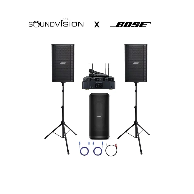 SHOWTIME Karaoke Set 2 ลำโพง BOSE SHOWTIME SK12 + ลำโพงซับ BOSE SUB2 + แอมป์ SOUNDVISION DKA-900 + ชุดไมค์ลอย SOUNDVISION SU-990D/HTP รวมถึงขาตั้งลำโพง และ ขายึดลำโพง เหมาะกับร้านหรือห้อง VIP หรือห้องคาราโอเกะในบ้านที่ต้องการความพรีเมี่ยม จากแบรนด์ BOSE และ SOUNDVISION