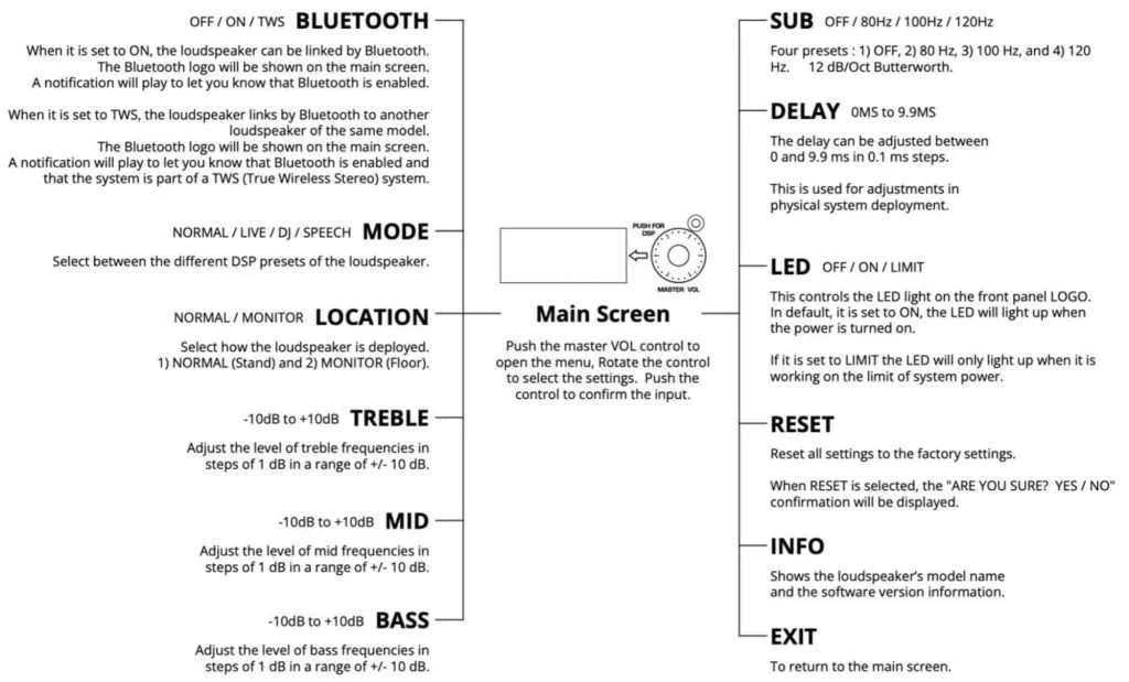 ที่ด้านหลังของลำโพงจะมี หน้าจอ และชุดควบคุมหลัก ซึ่งช่วยให้คุณเข้าถึงตัวเลือกการปรับแต่งต่าง ๆ ได้อย่างครบถ้วน สามารถ ปรับจูน รุ่นแอคทีฟ (TOURUS+A) ให้เหมาะสมกับสภาพแวดล้อมการใช้งาน เพื่อให้ได้เสียงที่ยอดเยี่ยมในทุกสถานที่