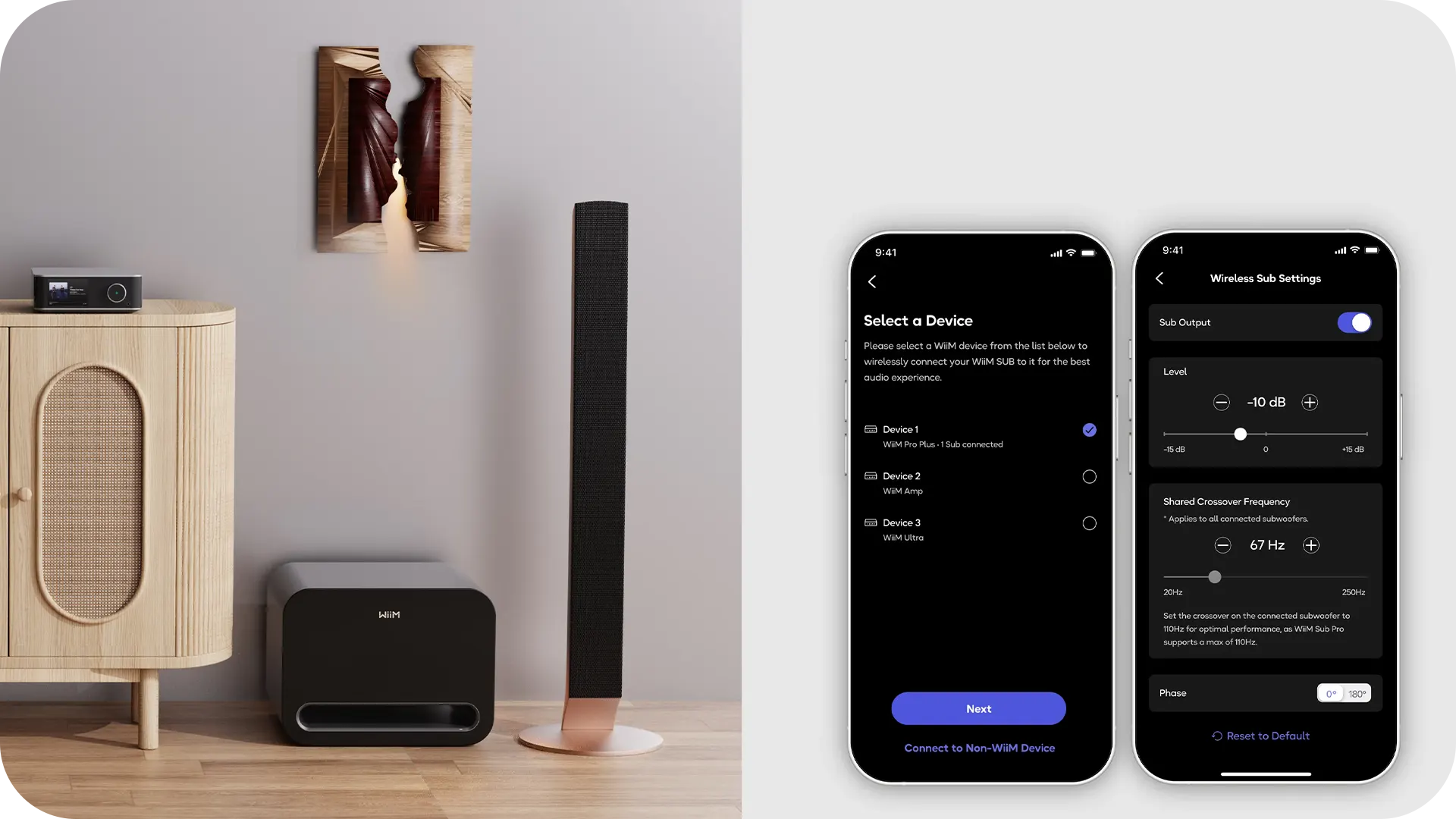 เลือก ลำโพง/แอมป์หลักของ WiiM ในแอป (หรือเสียบสาย RCA Sub-Out)
