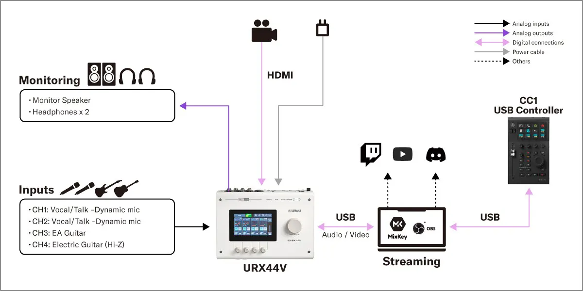 การตั้งค่านี้จะรวมไมโครโฟน เครื่องดนตรี อุปกรณ์ตรวจสอบ และแหล่งสัญญาณวิดีโอ HDMI เข้ากับขั้นตอนการทำงานด้านเสียงและวิดีโอแบบครบวงจร URX44V สามารถจัดการเสียงทั้งหมดที่กำลังเข้ามา ไม่ว่าจะเป็นเสียงพูด ไมโครโฟนสำหรับสนทนา และกีตาร์ เป็นต้น และส่งสัญญาณที่ผสมแล้วไปยังคอมพิวเตอร์ผ่าน USB เพื่อสตรีมมิ่งโดยใช้ซอฟต์แวร์ อย่างเช่น MixKey หรือ OBS