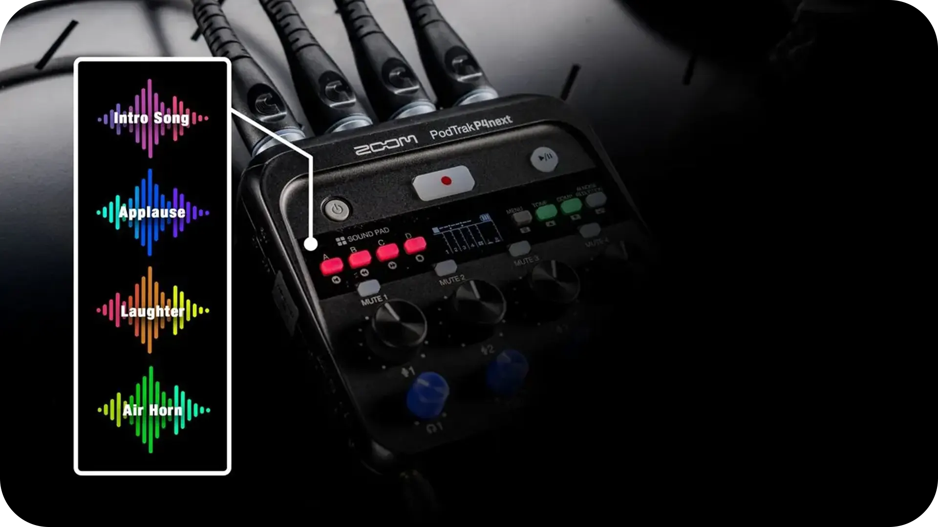 สร้างบรรยากาศให้พอดแคสต์ของคุณสนุก และมืออาชีพยิ่งขึ้น ด้วย Sound Pads จำนวน 4 ปุ่ม ที่กดใช้งานได้ทันทีเพียงปลายนิ้ว